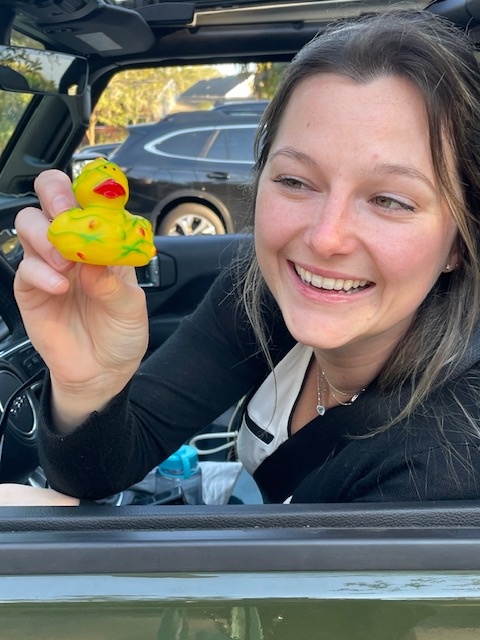 A woman in a car smiles joyfully as she holds up a colorful rubber duck toy towards the camera, celebrating.