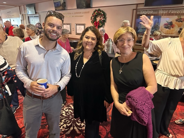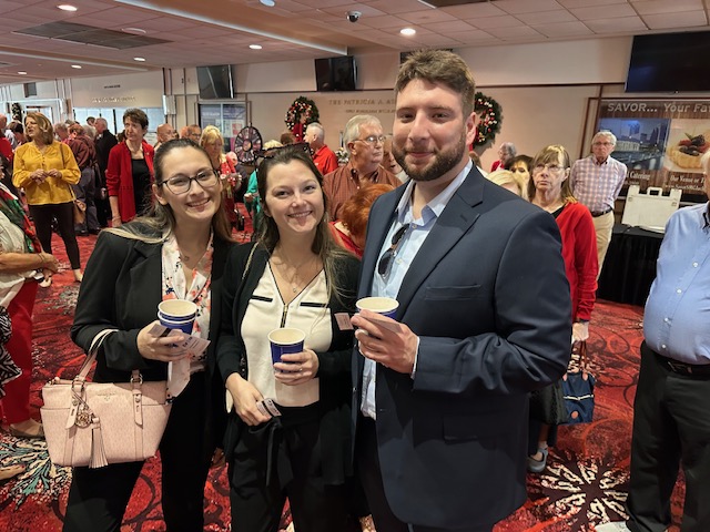 Three adults, two women and a man, celebrating at a holiday event in a room with festive decorations and other people in the background.