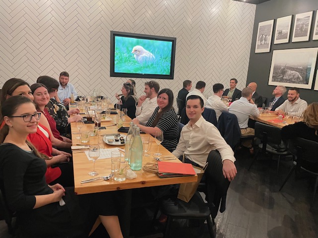 A group of people dressed in business attire sits around a long dining table in a stylish restaurant, smiling and engaged in conversation, with a television screen displaying an image of a bird in the background as they