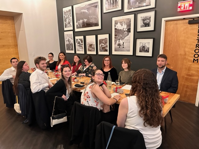 A group of people seated around a long wooden table in a restaurant, engaging in conversation. The walls are adorned with black and white photographs celebrating Ansbacher Law.