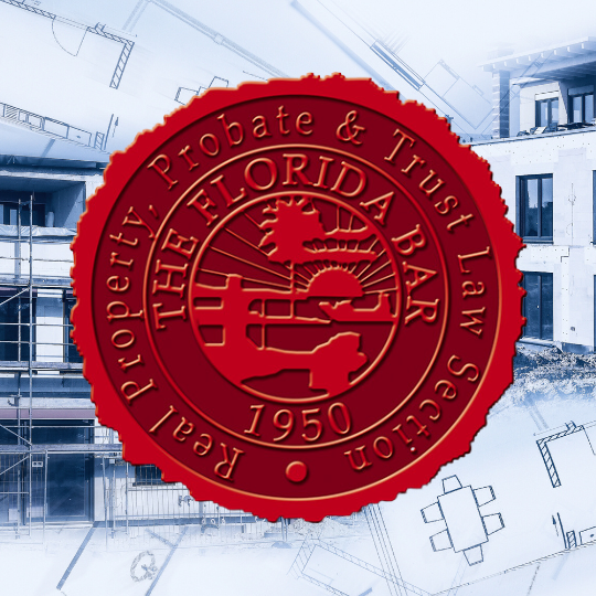A red seal with "The Florida Bar, Real Property, Probate & Trust Law Section, 1950" is centered over a background of architectural blueprints and a partially constructed building, hinting at the expertise fostered by the Florida Bar Construction Law Institute in anticipation of 2025 advancements.A professional portrait of attorney Barry B. Ansbacher, a bald man in a dark suit, blue shirt, and red tie, standing with arms crossed and smiling against a gray background.
