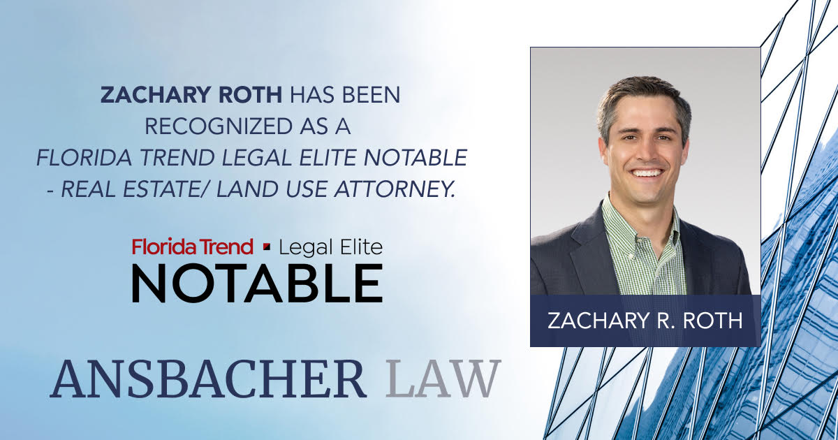 Ansbacher Law is pleased to share that Attorney Zachary Roth has been selected as a Florida Trend Legal Elite NOTABLE – Real Estate/Land Use Attorney.